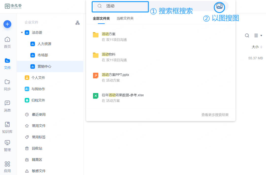 共享文件夹内的成员可以通过文件名称/关键词/文件类型/以图搜图等各种方式秒速检索所需资料;