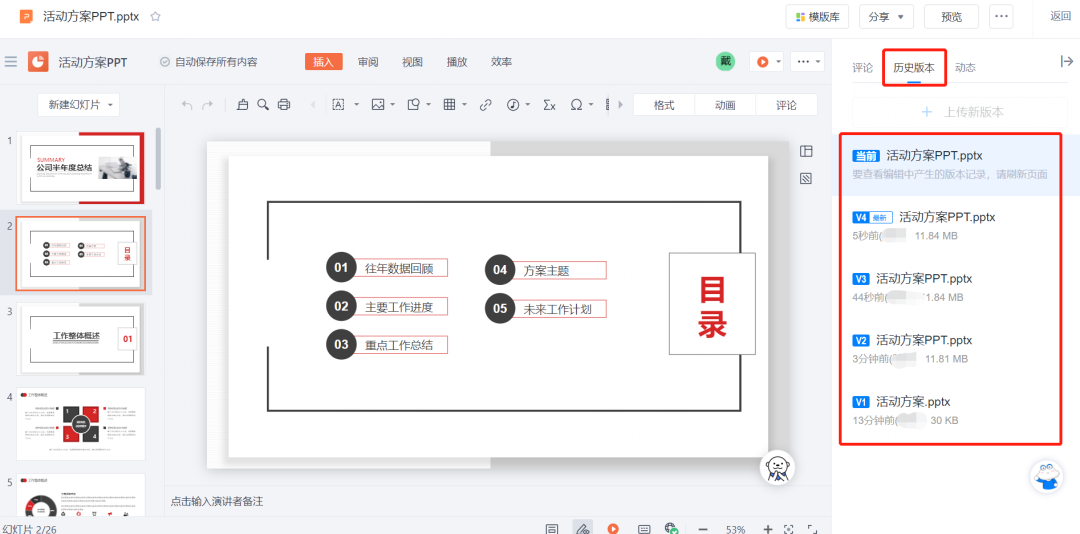 云盘中的文件资料实时呈现最新版本,不必担心搞错文件版本,同时支持保存文件的100个历史版本,随时可以追溯和恢复至任一版本。