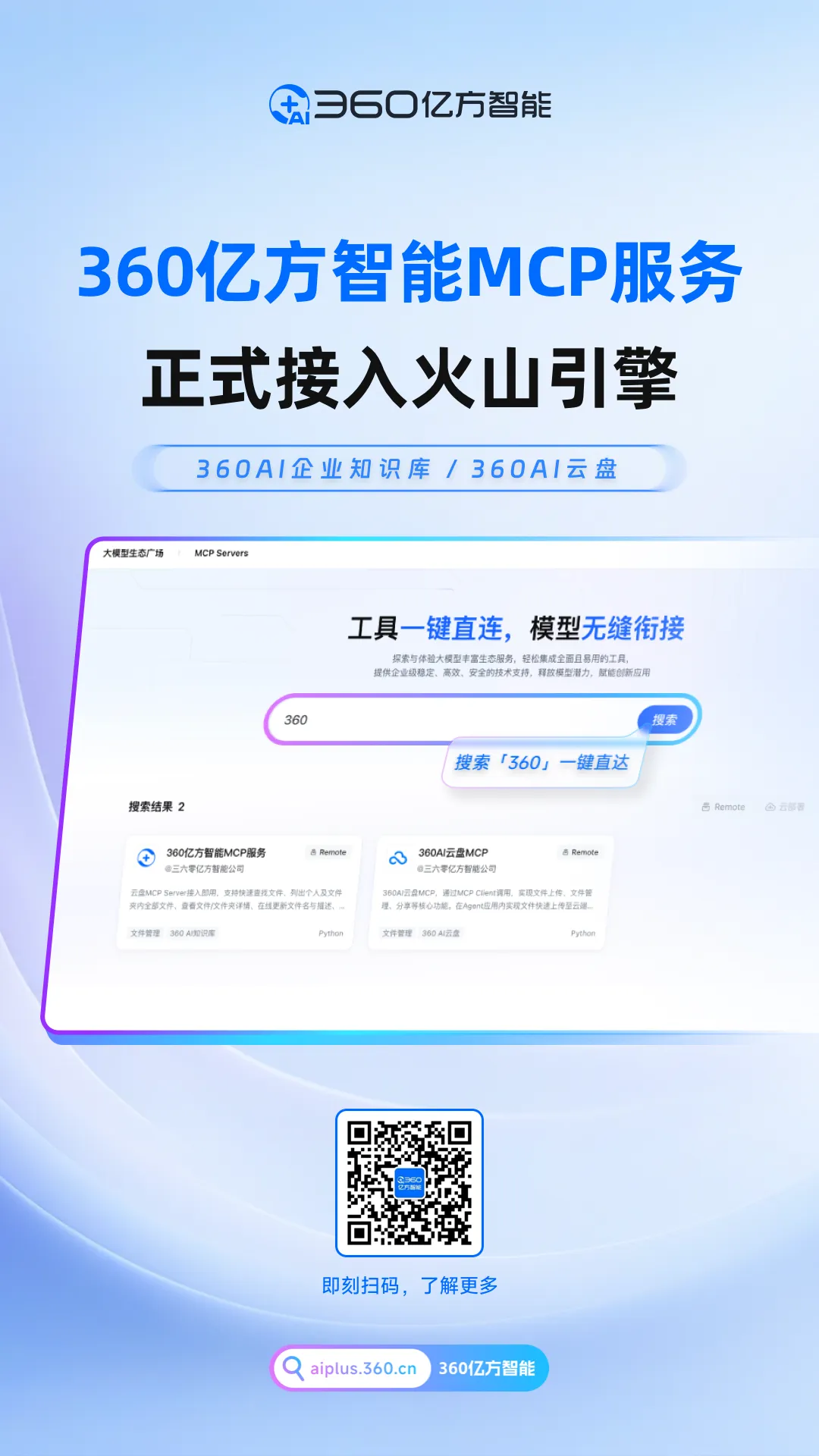 近日,继全面兼容MCP协议后,360亿方智能正式上线火山引擎大模型生态广场,推出即接即用的知识库与云盘MCP服务。此次合作旨在打通高质量企业私域知识与大模型应用之间的关键通道,为火山引擎生态内的AI开发者和企业用户提供企业私域知识支持与文件管理能力,提升企业知识应用效率,助力大模型应用落地迈出“最后一公里”。
